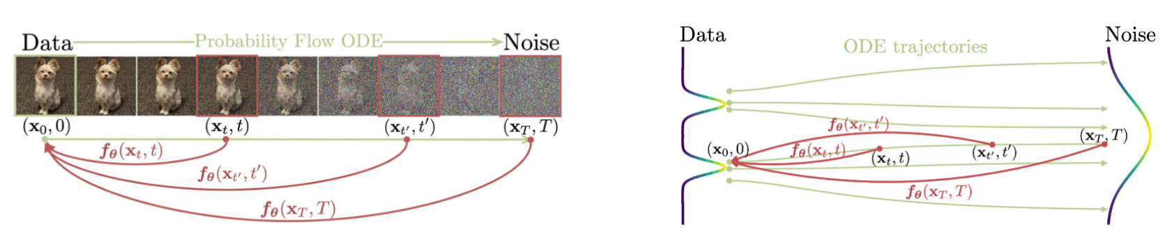 扩散模型虽然效果很好,但最大的缺点就是迭代式的生成效率太低。为了解决这个问题,宋飏等人在 Probability Flow ODE 的基础上建立了 consistency models,通过将 ODE 轨迹上的任何点(如 \(\mathbf x_t,\mathbf x_{t'},\mathbf x_T\))都映射到 ODE 的端点 \(\mathbf x_0\),从而实现从 \(\mathbf x_T\) 到 \(\mathbf x_0\) 的一步生成,如下图所示: