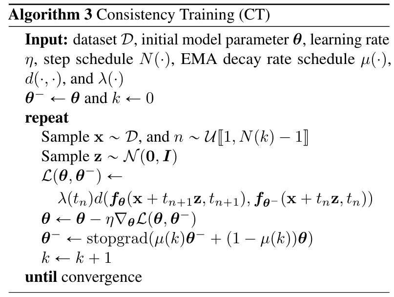 具体而言,采样 \(\mathbf x\sim p_\text{data},\,\mathbf z\sim\mathcal N(\mathbf0,\mathbf I)\),计算 \(\mathbf x_{t_{n+1}}=\mathbf x+t_{n+1}\mathbf z\),将这次采样视作对上述期望的估计,有: \[ \nabla\log p_{t_{n+1}}(\mathbf x_{})\approx -\frac{\mathbf z}{t_{n+1}} \] 所以一步去噪后的样本为: \[ \begin{align} \hat{\mathbf x}_{t_n}&=\mathbf x_{t_{n+1}}-(t_n-t_{n+1})t_{n+1}\cdot\left(-\frac{\mathbf z}{t_{n+1}}\right)\\ &=\mathbf x_{t_{n+1}}+(t_n-t_{n+1})\mathbf z\\ &=\mathbf x+t_{n+1}\mathbf z+(t_n-t_{n+1})\mathbf z\\ &=\mathbf x_t+t_n\mathbf z \end{align} \] 代入 consistency distillation loss,得到 consistency training loss 如下: \[ \mathcal L_\text{CT}^N(\theta,\theta^-)=\mathbb E\left[\lambda(t_n)d\left(\mathbf f_\theta(\mathbf x+t_{n+1}\mathbf z,t_{n+1}),\mathbf f_{\theta^-}(\mathbf x+t_n\mathbf z,t_n)\right)\right],\quad\mathbf z\sim \mathcal N(\mathbf0,\mathbf I) \] 算法如下所示: