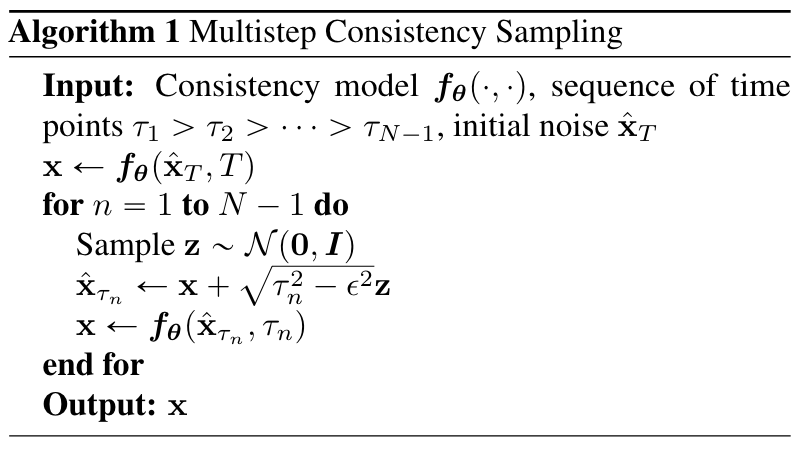 训练好 consistency model \(\mathbf f_\theta(\cdot,\cdot)\) 后,只需采样 \(\hat{\mathbf x}_T\sim\mathcal N(\mathbf 0,T^2\mathbf I)\),然后计算 \(\hat{\mathbf x}_\epsilon=\mathbf f_\theta(\hat{\mathbf x}_T,T)\) 即可。同时,我们也可以反复注入噪声来实现多步生成,算法如下所示: