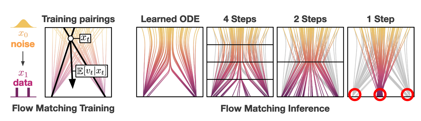 首先回顾一下 Flow Matching. 在训练的每一步中,Flow Matching 从源分布和目标分布中分别采样 \(\mathbf x_0,\mathbf x_1\),然后做线性插值 \(\mathbf x_t=(1-t)\mathbf x_0+t\mathbf x_1\),模型 \(\mathbf v_\theta\) 以 \(\mathbf x_t\) 为输入,预测速度方向 \(\mathbf v_t=\mathbf x_1-\mathbf x_0\),即: \[