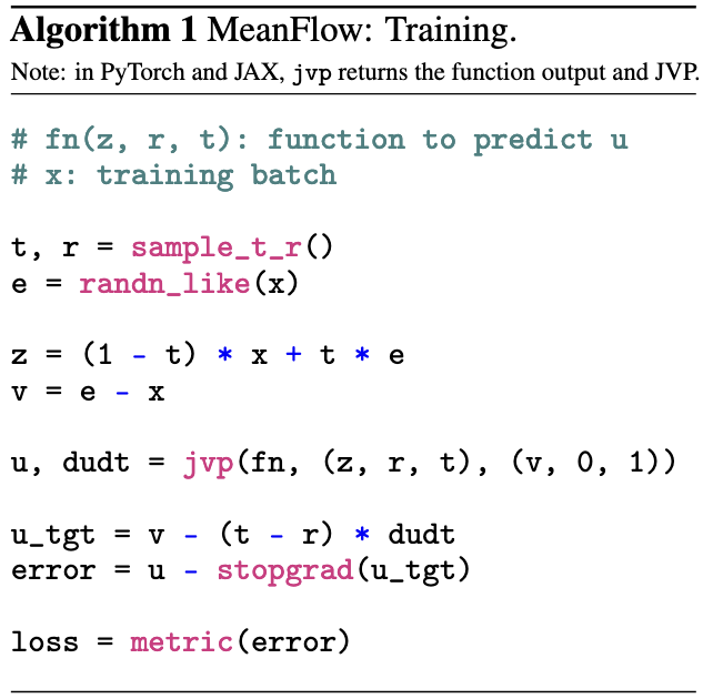 现在,我们只需训练一个模型 \(\mathbf u_\theta(\mathbf x_t,r,t)\) 使其满足 MeanFlow Identity 即可。构造如下损失函数: \[ \begin{align} &\mathcal L(\theta)=\mathbb E_{\mathbf x_t,r,t}\left[\Vert\mathbf u_\theta(\mathbf x_t,r,t)-\text{sg}(\mathbf u_\text{tgt})\Vert_2^2\right]\\ \text{where}\quad&\mathbf u_\text{tgt}=\mathbf v(\mathbf x_t,t)-(t-r)(\partial_\mathbf x\mathbf u_\theta\cdot\mathbf v(\mathbf x_t,t)+\partial_t\mathbf u_\theta) \end{align} \] 其中 \(\text{sg}(\cdot)\) 是停止梯度操作,防止计算 Jacobian 矩阵后还需对网络二次求导,提升训练效率。综上,MeanFlow 模型的训练算法流程如下: