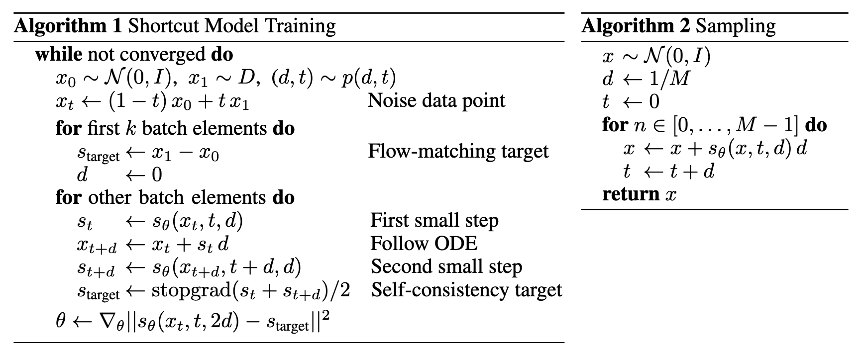 我们希望训练一个模型 \(\mathbf s_\theta(\mathbf x_t,t,d)\) 去近似 shortcut: \[ \mathbf s_\theta(\mathbf x_t,t,d)\xrightarrow{\text{approximate}}\mathbf s(\mathbf x_t,t,d) \] 如此即可实现一步/少步采样。
