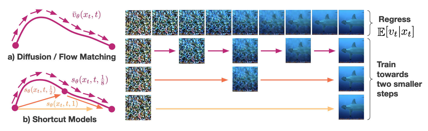 Shortcut Models 的核心思想是将采样步长 \(d\) 作为条件加入网络,使得网络能够考虑到采样轨迹的曲率,进而给出跨出 \(d\) 步长后准确的位置。直观上,Flow Matching 可以解释为学习瞬时速度,而 Shortcut Models 意在学习 \(d\) 时间内的平均速度。若模型得到了充分的学习,那么当 \(d=1\) 时,模型就给出了跨越整条采样轨迹的速度方向,从而实现一步采样。