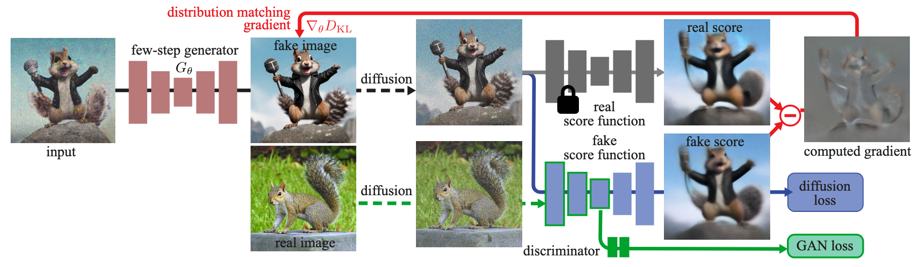 现在我们只需估计 \(\mathbf s_\text{real}(\mathbf x)\) 与 \(\mathbf s_\text{fake}(\mathbf x)\) 即可。对于 \(\mathbf s_\text{real}(\mathbf x)\),我们希望用预训练的扩散模型去估计。然而,由于 \(\mathbf x\) 采样自 \(p_\text{fake}\),预训练扩散模型无法给出一个准确的估计。借鉴 ScoreSDE 的做法,我们对其加以噪声扰动 \(\mathbf x_t=\alpha_t\mathbf x+\sigma_t\boldsymbol\epsilon\),并估计扰动后的 score: \[ \mathbf s_\text{real}(\mathbf x_t,t)=-\frac{\mathbf x_t-\alpha_t\boldsymbol\mu_\text{base}(\mathbf x_t,t)}{\sigma_t^2} \] 其中 \(\boldsymbol\mu_\text{base}(\mathbf x_t,t)\) 表示预训练的扩散模型。对于 \(\mathbf s_\text{fake}(\mathbf x)\),由于一步生成模型在不断更新,我们同步学习其 score function: \[ \begin{gather} \mathbf s_\text{fake}(\mathbf x_t,t)=-\frac{\mathbf x_t-\alpha_t\boldsymbol\mu_\text{fake}^\phi(\mathbf x_t,t)}{\sigma_t^2}\\ \mathcal L_\text{denoise}(\phi)=\mathbb E_{\mathbf z,\mathbf x,t,\mathbf x_t}\left[\Vert\boldsymbol\mu_\text{fake}^\phi(\mathbf x_t,t)-\mathbf x\Vert_2^2\right] \end{gather} \] 其中 \(\boldsymbol\mu_\text{fake}^\phi(\mathbf x_t,t)\) 是与一步生成模型同步学习的扩散模型。于是,对于 \(t\) 时刻的带噪分布,有: \[ \begin{align} \nabla_\theta D_\text{KL}(p_\text{fake}\Vert p_\text{real})&=\mathbb E_{\mathbf z,t,\mathbf x_t}\left[(\mathbf s_\text{fake}(\mathbf x_t,t)-\mathbf s_\text{real}(\mathbf x_t,t))\frac{\mathrm d\mathbf x_t}{\mathrm d\theta}\right]\\ &=\mathbb E_{\mathbf z,t,\mathbf x_t}\left[(\mathbf s_\text{fake}(\mathbf x_t,t)-\mathbf s_\text{real}(\mathbf x_t,t))\frac{\mathrm d\mathbf x_t}{\mathrm dG_\theta(\mathbf z)}\frac{\mathrm dG_\theta(\mathbf z)}{\mathrm d\theta}\right]\\ &=\mathbb E_{\mathbf z,t,\mathbf x_t}\left[\alpha_t(\mathbf s_\text{fake}(\mathbf x_t,t)-\mathbf s_\text{real}(\mathbf x_t,t))\frac{\mathrm dG_\theta(\mathbf z)}{\mathrm d\theta}\right]\\ &\simeq\,\mathbb E_{\mathbf z,t,\mathbf x_t}\left[w_t\alpha_t(\mathbf s_\text{fake}(\mathbf x_t,t)-\mathbf s_\text{real}(\mathbf x_t,t))\frac{\mathrm dG_\theta(\mathbf z)}{\mathrm d\theta}\right]\\ \end{align} \] 其中 \(w_t\) 是不改变最优解的权重,用于平衡不同时间步下的梯度大小,设置为 \(w_t=\frac{\sigma_t^2}{\alpha_t}\frac{CS}{\Vert\boldsymbol\mu_\text{base}(\mathbf x_t,t)-\mathbf x\Vert_1}\),其中 \(C,S\) 分别表示 channels 数量与空间位置数量。作者构造了如下损失,使其梯度为上式: \[ \mathcal L_\text{KL}(\theta)=\mathbb E_{\mathbf z,t,\mathbf x_t}\left[\frac{1}{2}\Big\Vert G_\theta(\mathbf z)-\text{sg}\big[G_\theta(\mathbf z)-(w_t\alpha_t(\mathbf s_\text{fake}(\mathbf x_t,t)-\mathbf s_\text{real}(\mathbf x_t,t)))\big]\Big\Vert_2^2\right]\\ \] 然而,仅仅依靠 KL 散度依旧不够:当 \(t\) 接近 0 时,\(p_\text{real}(\mathbf x_t,t)\) 接近 0,导致 \(\mathbf s_\text{real}(\mathbf x_t,t)\) 的估计误差很大;另外,作者发现优化结果容易发生 mode collapse/dropping. 为了解决这个问题,作者进一步引入了回归损失:利用预训练的扩散模型生成若干噪声-样本对 \(\mathcal D=\{\mathbf z,\mathbf y\}\) 作为标签去训练一步生成模型: \[ \mathcal L_\text{reg}(\theta)=\mathbb E_{(\mathbf z,\mathbf y)\sim\mathcal D}[\text{LPIPS}(G_\theta(\mathbf z),\mathbf y)] \] 综上,一步生成模型的总损失为: \[ \mathcal L(\theta)=\mathcal L_\text{KL}(\theta)+\lambda_\text{reg}\mathcal L_\text{reg}(\theta) \] 同时用 \(\mathcal L_\text{denoise}(\phi)\) 训练估计 fake 样本 score function 的扩散模型。方法示意图如下: